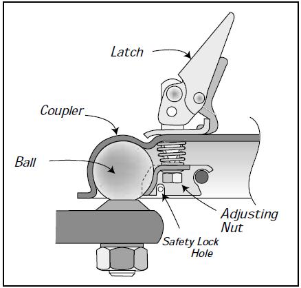 Coupling and Uncoupling the Trailer - A secure coupling (or fastening) of the trailer to the tow vehicle is essential. A loss of coupling may result in death or serious injury. Therefore, you must understand and follow all of the instructions for coupling. The following parts are involved in making a secure coupling between the trailer and tow vehicle: